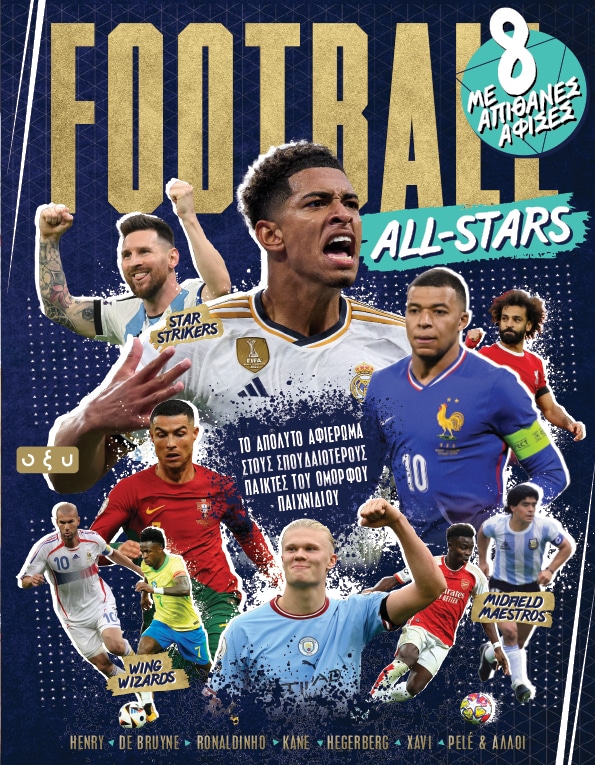 Με περίπου 3,5 δισεκατομμύρια οπαδούς σε όλο τον κόσμο, το ποδόσφαιρο είναι αναμφίβολα το πιο δημοφιλές άθλημα στον πλανήτη. Τίποτα δεν το πλησιάζει. Ένας από τους λόγους που το αγαπάμε τόσο πολύ; Οι σούπερ σταρ που έχουν ευλογήσει τα γήπεδα σε όλη την υφήλιο, από το Μπουένος Άιρες και το Ρίο ντε Τζανέιρο μέχρι το Λονδίνο, το Παρίσι, τη Μαδρίτη και ακόμα παραπέρα, οι παίκτες που μας σηκώνουν από τις θέσεις μας, μας διασκεδάζουν και μας συναρπάζουν κάθε φορά που βάζουν τις φανέλες και δένουν τα κορδόνια τους, αυτοί που μας υπενθυμίζουν γιατί ερωτευτήκαμε το όμορφο παιχνίδι εξαρχής. Τους λατρεύουμε, φοράμε τα ονόματά τους στην πλάτη μας και, όταν παίζουμε στο γήπεδο, πάντα προσπαθούμε να τους μοιάσουμε. Στο Football All-Stars τιμούμε τους σπουδαιότερους παίκτες του κόσμου, από τους μαέστρους του κέντρου και τους λυσσασμένους αμυντικούς μέχρι τους σταρ επιθετικούς και τους τερματοφύλακες που αναλαμβάνουν να τους σταματήσουν. Ανακαλύψτε ακόμη τις συναρπαστικές ιστορίες των θρύλων του παρελθόντος, όπως ο Ντιέγκο Μαραντόνα και ο Πελέ, αλλά και τους σταρ του παρόντος, όπως ο Τζουντ Μπέλινγκχαμ, ο Κιλιάν Εμπαπέ, ο Λιονέλ Μέσι και πολλοί ακόμα. Μαζί με όλα αυτά, θα βρείτε και οκτώ εντυπωσιακές αφίσες με τους αγαπημένους σας ποδοσφαιρικούς ήρωες!