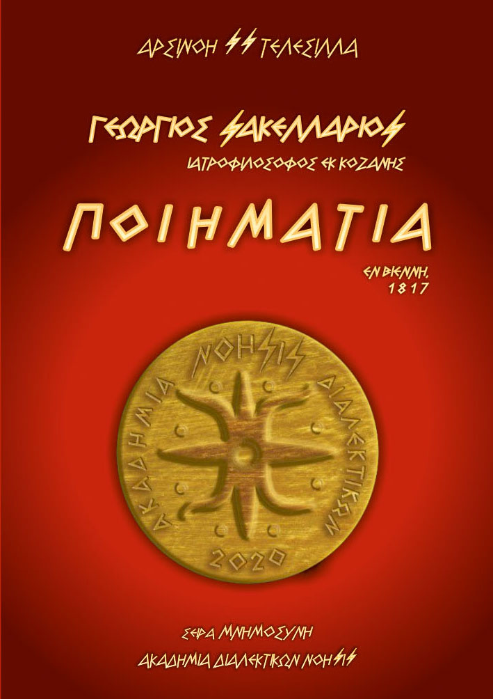 ΓΕΩΡΓΙΟΣ Κ. ΣΑΚΕΛΛΑΡΙΟΣ (1767-1838) ΙΑΤΡΟΦΙΛΟΣΟΦΟΣ & ΠΟΙΗΤΗΣ .. ΜΕΓΑΣ ΕΛΛΗΝ Μέγας Εκπρόσωπος του ΝεοΕλληνικού Διαφωτισμού. Σύντροφος του Ρήγα.. Μυημένος στην Επαναστατική Εταιρεία της Ε. Μαμάκη-Σενιέ «Ελληνόγλωσσον Ξενοδοχείον» και στην «Φιλόμουσον Εταιρείαν Βιέννης» του Καποδίστρια.. Πρόδρομες Οργανώσεις της Φιλικής Εταιρείας. Το 1817 στην Βιέννη, εκδίδει σε καλλιτεχνικό τόμο την εξαιρετική Ποιητική Συλλογή του, «Ποιημάτια». Χρηματοδοτείται από τον Κοζανίτη έμπορο, Κ. Τακιατζή, τον οποίο ευχαριστεί αποκαλώντας τον «Ευεργέτη του Γένους και της Πατρίδος». Βασικό θέμα, ο θάνατος της πρώτης γυναίκας του. Αξιοθαύμαστη, η Έμμετρη Αλληλογραφία που περιλαμβάνεται, με τον ομότεχνο & φίλο του, Μ. Περδικάρη. Στην Ποιητική αυτή αλληλογραφία, οι δύο Ιατροί-Ποιητές αποκαλύπτουν τις ευαισθησίες τους, τις γνώσεις της Ελληνικής Μυθολογίας, αλλά και τις στιχουργικές τους ικανότητες, που η αλληγορική παρουσίαση των Ελλήνων Θεών, τους επιτρέπει να διατηρήσουν την ποιότητα της Ποίησής τους, ακόμη και όταν σχολιάζουν θέματα Επιστημονικά και Φιλοσοφικά. Εμπνέονται και Εμπνέουν.. Ελλάδα!! Ι ΗΤΡΟΣ ΓΑΡ ΦΙΛΟΣΟΦΟΣ .. Ι ΣΟΘΕΟΣ Ι ΠΠΟΚΡΑΤΗΣ - ΠΕΡΙ ΕΥΣΧΗΜΟΣΥΝΗΣ