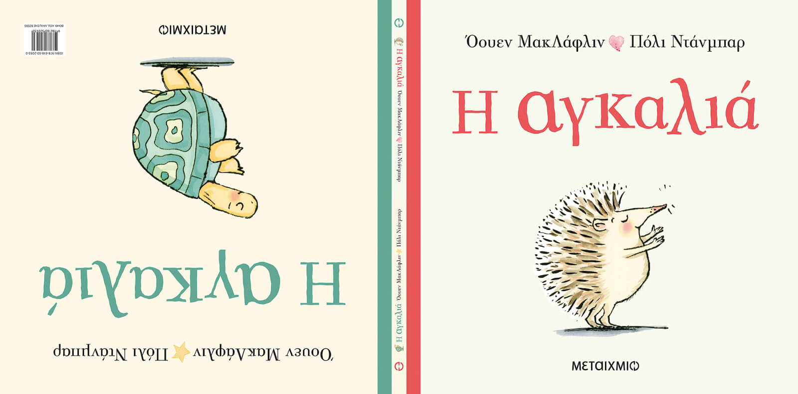 Ένας σκαντζόχοιρος και μια χελώνα γυρεύουν μια αγκαλιά. Ζητούν από κάθε ζώο που συναντούν να τους κάνει τη χάρη, όμως κανείς δε θέλει να τους αγκαλιάσει. Ώσπου μια σοφή κουκουβάγια τούς εξηγεί τον λόγο: Ο σκαντζόχοιρος έχει αγκάθια· η χελώνα σκληρό καβούκι. Τότε όμως είναι που βρίσκουν ο ένας τον άλλο! Ένα "διπλό" βιβλίο, με δύο ιστορίες που συναντιούνται στη μέση!