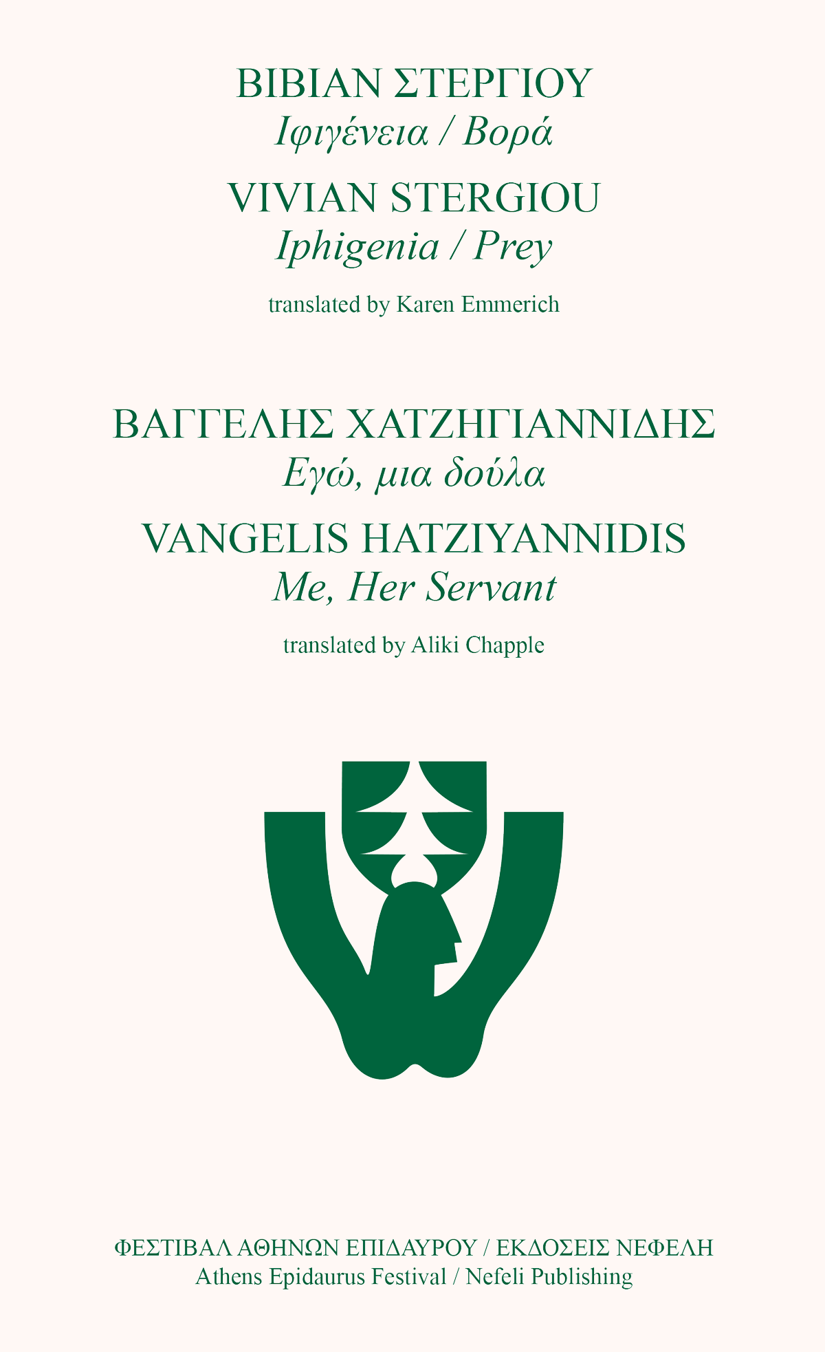 Η Βίβιαν Στεργίου εμπνέεται από την Ιφιγένεια εν Αυλίδι του Ευριπίδη εστιάζοντας στη στιγμή λίγο πριν τη θυσία της ηρωίδας. «Δεν πειράζει να πεθάνω, όμως πρώτα θ’ ακουστώ», λέει, φτύνοντας τις λέξεις – μοναδικό της όπλο. Κι όσο μονολογεί υπάρχει εδώ και τώρα. Μόλις πάψει, πεθαίνει από χίλιες μεριές, σ’ όλα τα μέρη. Παντού και πάντα θριαμβεύει ο χρησμός. Η θυσία της είναι κωμική, ελάχιστα τραγική. Σκάβει τον λάκκο της και μπαίνει μέσα. Θυσία για το τίποτα. Κρέας για φάγωμα. Vivian Stergiou is inspired by Euripides’ Iphigenia in Aulis. She focuses on the moment before Iphigenia is sacrificed. It doesn’t matter if I die, but first, I’ll make myself heard, she says, spitting the words—her only weapon. And while she speaks, she exists, here and now. When she stops, she dies from a thousand different directions, from all sides. Forever and always the oracle triumphs. Her sacrifice is comic, barely tragic. She digs her grave and climbs in. A sacrifice for nothing. Meat to be eaten. Ο Βαγγέλης Χατζηγιαννίδης γράφει με αφορμή την Εκάβη του Ευριπίδη ένα κείμενο διασκεδαστικό και ευφρόσυνο που απομυθοποιεί το απόλυτο σύμβολο θρήνου και απόγνωσης, μέσα από τη ματιά ενός προσώπου το οποίο την έζησε από κοντά και αντιλήφθηκε πράγματα που δεν αποτυπώθηκαν ποτέ στα έργα των μεγάλων ποιητών. Η κοινή ανθρώπινη ματιά, το μικρό ανθρώπινο μέτρο, απέναντι στον μεγάλο μύθο. Η πορεία της τραγικής Εκάβης μέσα από ένα λοξό, απρόσμενο κοίταγμα. Vangelis Hatziyannidis writes based on Euripides’ Hecuba an entertaining and light-hearted text that demystifies the ultimate symbol of grief and despair, through the eyes of a person who lived close to her and perceived things that were never captured in the works of the great poets. The common human gaze, the small human measure, in contrast to the great myth. The path of the tragic Hecuba through an oblique, unexpected perspective.