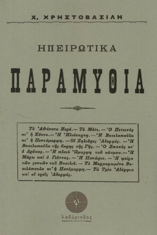 "Τα καημένα μου τα παιδιά, ακολουθώντας την τύχη μου, ίσως και την τύχη του σπιτιού μου, που το κυνηγάει κάποια κακομοιριά εδώ κι εκατό χρόνια, γεννήθηκαν μακρυά από την καλοχείμωνη και γλυκοκαλόκαιρη πατρίδα μου, την Ήπειρο, όπου κάθε πέτρα, κάθε χάλασμα και κάθε λακκιά έχουν το τραγούδι τους, την παράδοσή τους και το παραμύθι τους. Αυτό μ ανάγκασε να τους λέω συχνά όσα παραμύθια δεν εξάλειψε από το μνημονικό μου ο καιρός, για να αιστανθούν κι αυτά εκείνη την άρρητη τη γλύκα, που αιστάνονται όσα παιδιά έχουν την ευτυχία να γεννιούνται και ν αναθρέφονται στο χωριό τους ή στην πολυτία τους, ακούοντας τα γλυκά τα παραμύθια από το στόμα της Βάβως του σπιτιού. Για τα ξενιτεμένα Ηπειρωτόπουλα λοιπόν δημοσιεύω αυτή τη σειρά των Παραμυθιών μου, τα ωνόμασα δε Ηπειρωτικά, διότι είναι όλα βγαλμένα από τους βράχους κι από τα χαλάσματα κι από τα λακκώματα της πατρίδας μου". Περιέχει τα παραμύθια: Το Αθάνατο Νερό Το Μάτι Ο Πετεινός κι η Κόττα Η Ηλιόταχτη Η Βασιλοπούλα κι η Πεντάμορφη Οι Ζηλιάρες Αδερφές Η Βασιλοπούλα της άκρης της Γης Ο Σπανός κι ο Δράκος Η πλειό Ώμορφη του κόσμου Η Μάρω και ο Γιάννος Η Πανώρια Η ψείρα των γενυών του Βασιλιά Το Μαρμαρωμένο Βασιλόπουλο κι η Πανέμορφη