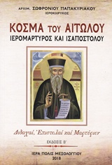 Ο αείμνηστος αρχιμανδρίτης π. Σωφρόνιος Παπακυριακού, ιεροκήρυξ της Ιεράς Μητροπόλεώς μας, διηκόνησε την τοπική μας Εκκλησία επί αρχιερατείας του αοιδίμου Μητροπολίτου Αιτωλίας και Ακαρνανίας κυρού Ιεροθέου Παρασκευοπούλου. Ο πατήρ Σωφρόνιος ήταν σοφός νους, λογιώτατος κληρικός και χειριστής άριστος, όσον ολίγο, της ελληνικής γλώσσης, αρχαίας και νεοελληνικής. Το συγγραφικό του έργο διακρίνεται όχι μόνο για τα εμπεριστατωμένα κείμενά του, αλλά και τον τέλειο χειρισμό της λογίας ελληνικής γλώσσης. [...] Καρπός της σπουδαίας του συγγραφής είναι και το πόνημα τούτο το οποίο αναφέρεται στο βίο, την πολιτεία, τις διδαχές και τις προφητείες του Αγίου Κοσμά του Αιτωλού, του Πολιούχου και Προστάτου της Ιεράς μας Μητροπόλεως. [...] Σήμερα, στους αντιπνευματικούς και ψυχρούς καιρούς μας, στην εποχή μας κατά την οποία η ίδια η θεότης του Κυρίου και Θεού μας Ιησού Χριστού αμφισβητείται, περιφρονείται, αγνοείται και πολεμείται μάλιστα από κοιμισμένα και θολωμένα μυαλά, ο ορθόδοξος, ο καθαρός, ο αφυπνιστικός λόγος του Αγίου Κοσμά είναι ανάγκη να φθάση σε κάθε άνθρωπο, που ενώ λέγεται, δεν είναι χριστιανός. Ο Άγιος Κοσμάς αφιέρωσε όλη του τη ζωή για να κηρύξη "Χριστόν Εσταυρωμένον και Αναστάντα", για να ομολογήση τη θεότητά Του, έχυσε και το αίμα του με το μαρτύριο, για την αγάπη του Θεανθρώπου Κυρίου. [...] (από τον πρόλογο του βιβλίου)