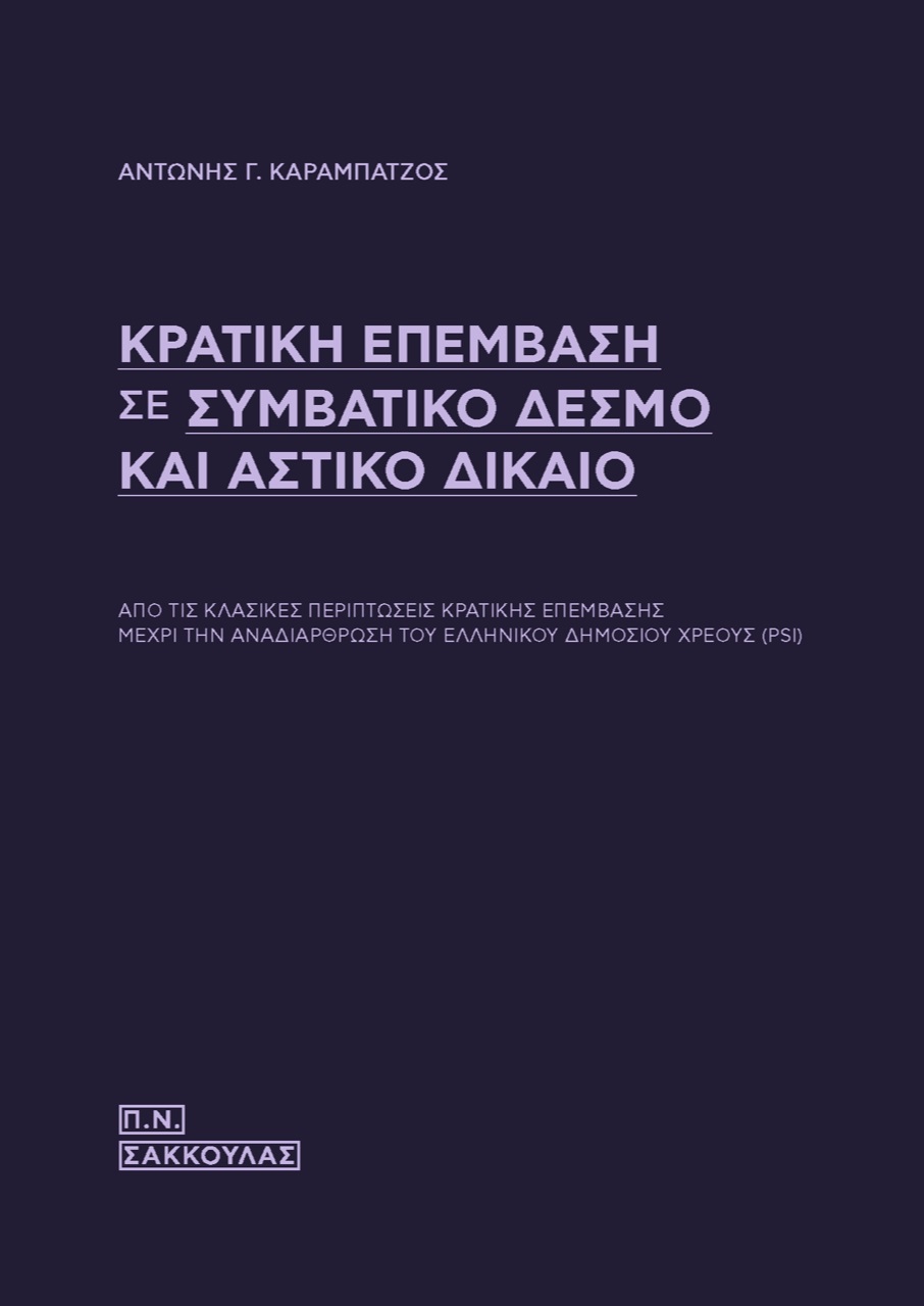 Η μονογραφία πραγματεύεται, κατά κύριο λόγο, τους όρους υπό τους οποίους μπορεί να είναι θεμιτή μία επέμβαση του κράτους σε υφιστάμενο συμβατικό δεσμό, όπως επίσης και τις αστικού δικαίου έννομες συνέπειες μιας τέτοιας επέμβασης, ιδίως δε τα δικαιώματα που έχει τότε ένας ιδιώτης που έχει συμβληθεί με το Δημόσιο. Βασική παραδοχή του συγγραφέα είναι ότι η δραστηριοποίηση του Δημοσίου στο συμβατικό πεδίο, ακόμη και όταν αυτή λαμβάνει την μορφή διοικητικής συμβάσεως, διέπεται σε σημαντικό βαθμό από τις διατάξεις και τις αρχές του δικαίου περί συμβάσεων του ΑΚ. Στην μονογραφία αναδεικνύεται ακριβώς η σημασία της εφαρμογής αυτών των διατάξεων και αρχών στο πεδίο των συμβάσεων που συνάπτει το Δημόσιο. Η εφαρμογή τους παρέχει στον εφαρμοστή του δικαίου την δυνατότητα να εκμεταλλευθεί το πλούσιο απόθεμα λύσεων που διαθέτει το παραδοσιακό ιδιωτικό δίκαιο των συμβάσεων· κατά τον συγγραφέα, η αξία του αποθέματος αυτού εμφαίνεται προεχόντως σε ζητήματα ερμηνείας των συμβάσεων, απρόβλεπτης μεταβολής των συνθηκών και ανώμαλης εξέλιξης της συμβατικής ενοχής. Στο πλαίσιο αυτό, ιδιαίτερη έμφαση δίνεται στις δημόσιες συμβάσεις, τις συμβάσεις που έχουν κυρωθεί με νόμο, καθώς και σε συμβατικές ρήτρες κατανομής κινδύνων που περιέχονται σε συμβάσεις παραχώρησης ή μεγάλες επενδυτικές συμβάσεις μεταξύ ιδιωτών και Δημοσίου. Η όλη ανάλυση συνοδεύεται από μία εξαντλητική παράθεση, επεξεργασία αλλά και κριτικό σχολιασμό τόσο της εγχώριας όσο και της υπερεθνικής και διεθνούς διαιτητικής νομολογίας. Ξεχωριστά δε κεφάλαια αφιερώνονται στο PSI και το έκτακτο συμβατικό δίκαιο που επιβλήθηκε εξαιτίας της πανδημίας του κορωνοϊού.