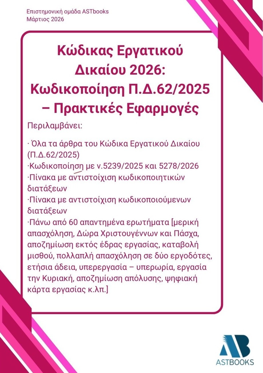 Κυκλοφορεί η νέα, επικαιροποιημένη έκδοση «Κώδικας Εργατικού Δικαίου 2026: Κωδικοποίηση Π.Δ.62/2025 – Πρακτικές Εφαρμογές», η οποία φιλοδοξεί να αποτελέσει σημείο αναφοράς για την ερμηνεία και την εφαρμογή του εργατικού δικαίου στο σύγχρονο κανονιστικό του περιβάλλον. Η κωδικοποίηση της εργατικής νομοθεσίας αποτελεί διαχρονικό αίτημα της νομικής θεωρίας και της πράξης, καθώς η πολυνομία, η αποσπασματικότητα και οι συνεχείς νομοθετικές τροποποιήσεις των τελευταίων δεκαετιών έχουν καταστήσει την εφαρμογή του εργατικού δικαίου ιδιαίτερα απαιτητική για όλους τους εμπλεκόμενους στην αγορά εργασίας. Με το Π.Δ.62/2025 (ΦΕΚ Α’ 121/11.7.2025) επιχειρείται για πρώτη φορά η ενοποίηση του ατομικού και του συλλογικού εργατικού δικαίου σε ένα ενιαίο, συστηματικό και λειτουργικό κείμενο, τον «Κώδικα Εργατικού Δικαίου». Η παρούσα έκδοση αποτυπώνει το πλήρες κείμενο του Κώδικα, όπως αυτό έχει διαμορφωθεί μετά την κωδικοποίησή του, ενσωματώνοντας τις ουσιώδεις παρεμβάσεις των ν.5239/2025 και ν.5278/2026. Ο ν.5239/2025 σηματοδοτεί τη στροφή του εργατικού δικαίου προς τη διαφάνεια, την απλοποίηση και την ψηφιοποίηση των εργασιακών σχέσεων, με σημαντικές μεταβολές σε ζητήματα χρόνου εργασίας, αδειών, υπερωριακής απασχόλησης, προστασίας από την απόλυση, καθώς και στη λειτουργία του Πληροφοριακού Συστήματος «ΕΡΓΑΝΗ ΙΙ» και της ψηφιακής κάρτας εργασίας. Παράλληλα, ο ν.5278/2026 ενσωματώνεται στον Κώδικα ως βασικός πυλώνας ενίσχυσης του συλλογικού εργατικού δικαίου, υλοποιώντας τη νομοθετική κατοχύρωση της Εθνικής Κοινωνικής Συμφωνίας και ενισχύοντας τον ρόλο των συλλογικών διαπραγματεύσεων. Οι ρυθμίσεις του νόμου αυτού επαναπροσδιορίζουν κρίσιμες έννοιες, όπως η μετενέργεια και η επέκταση των συλλογικών συμβάσεων, η λειτουργία των μητρώων συνδικαλιστικών οργανώσεων και εργοδοτών, καθώς και το πλαίσιο μεσολάβησης και διαιτησίας. Ιδιαίτερη έμφαση δίνεται στη σύνδεση της νομοθετικής ρύθμισης με την καθημερινή πρακτική. Η έκδοση περιλαμβάνει περισσότερα από εξήντα (60) πραγματικά, απαντημένα ερωτήματα που έχουν απασχολήσει επαγγελματίες λογιστές και φοροτεχνικούς, καλύπτοντας ζητήματα όπως η τηλεργασία, η πρακτική άσκηση, τα Δώρα Χριστουγέννων και Πάσχα, οι παροχές σε είδος, το διάλειμμα, η εγκυμοσύνη της εργαζόμενης, το εργατικό ατύχημα, οι επιχειρήσεις προσωρινής απασχόλησης (ΕΠΑ), η υπερεργασία και η υπερωρία, η εργασία κατά την Κυριακή, η αποζημίωση απόλυσης, η ασθένεια και η εφαρμογή της ψηφιακής κάρτας εργασίας. Η προσέγγιση αυτή καθιστά το έργο όχι μόνο ερμηνευτικό, αλλά και άμεσα αξιοποιήσιμο στην πράξη. Στο τέλος του Κώδικα περιλαμβάνονται δύο χρηστικοί πίνακες: ο Πίνακας Κωδικοποιητικών Διατάξεων και ο Πίνακας Κωδικοποιούμενων Διατάξεων. Τα εργαλεία αυτά ενισχύουν τη διαφάνεια, τη νομική ασφάλεια και τη δυνατότητα άμεσης αναζήτησης και διασταύρωσης των εφαρμοστέων ρυθμίσεων. Η έκδοση απευθύνεται σε νομικούς, λογιστές, φοροτεχνικούς, στελέχη επιχειρήσεων, συνδικαλιστικούς φορείς, καθώς και σε όσους καλούνται να εφαρμόσουν, να ερμηνεύσουν ή να διδάξουν το εργατικό δίκαιο στο νέο, ενιαίο και διαρκώς εξελισσόμενο κανονιστικό του πλαίσιο.