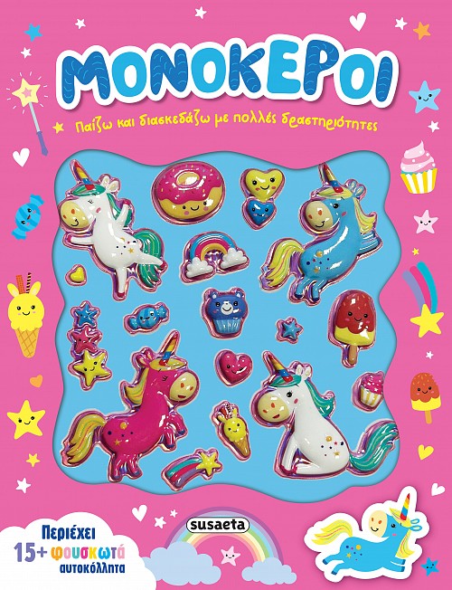 Στη Χώρα των Μονόκερων είναι πάντα γιορτή! Ακολούθησε τους φίλους σου μέσα από τις πιο διασκεδαστικές δραστηριότητες και κόλλησε τα φουσκωτά, τρισδιάστατα αυτοκόλλητα όπου εσύ θέλεις!