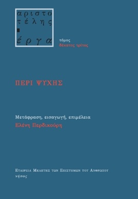 Το αρχαίο κείμενο της παρούσας έκδοσης είναι του Ross στη στερεότυπη έκδοση της Οξφόρδης του 1956. Στις υποσημειώσεις της μετάφρασης σημειώνω τις διαφορετικές γραφές που έχω επιλέξει, τις οποίες έχω ενσωματώσει στο αρχαίο κείμενο. Εκτός από ελάχιστες περιπτώσεις, προτιμώ τις γραφές των χειρογράφων. Η συγκεκριμένη σειρά φιλοδοξεί να δώσει στις αναγνώστριες και τους αναγνώστες, εκτός από μία σύγχρονη μετάφραση, και έναν οδηγό πλοήγησης στα κείμενα και τη φιλοσοφία του Αριστοτέλη στο σύνολό της, γι'' αυτό στις υποσημειώσεις δεν αναφέρομαι κατά κανόνα στις διαφορετικές ερμηνείες και συζητήσεις των σύγχρονων σχολιαστών. Προτείνω ερμηνείες των εννοιών, των θέσεων και των επιχειρημάτων του κειμένου, καθώς και συνδέσεις με άλλα έργα του Αριστοτέλη, ελπίζοντας ότι θα συντελέσουν στο να ξεπεραστεί κάπως η ελλειπτικότητα του συναρπαστικού αυτού έργου. Το Περί ψυχής είναι ένα έργο που έχει σχολιαστεί πολύ και από πολλούς. Οι σχολιασμένες εκδόσεις τις οποίες συμβουλεύτηκα περισσότερο ήταν του Hicks (1907), του Bodetis (1993), του Shields (2016) και το σχόλιο του Polansky, το οποίο, αν και αρκετά φλύαρο, παρουσιάζει διεξοδικά τα ερμηνευτικά ζητήματα που θέτει το Περί ψυχής.
