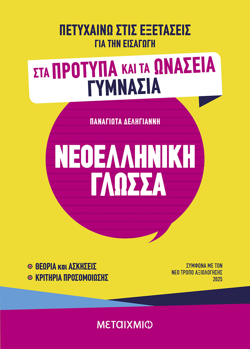 ΣΥΜΦΩΝΑ ΜΕ ΤΟΝ ΝΕΟ ΤΡΟΠΟ ΑΞΙΟΛΟΓΗΣΗΣ 2025 Το βιβλίο αυτό είναι πλήρες βοήθημα για το μάθημα της Νεοελληνικής Γλώσσας και έχει στόχο να βοηθήσει τους μαθητές και τις μαθήτριες να ανταποκριθούν με επιτυχία στις εξετάσεις για την εισαγωγή τους στα Πρότυπα, τα Ωνάσεια και τα ιδιωτικά γυμνάσια. Ταυτόχρονα, αποτελεί και έγκυρο εκπαιδευτικό υλικό για τους μαθητές που θέλουν να προετοιμαστούν σωστά για τις απαιτήσεις του μαθήματος στο γυμνάσιο. Περιλαμβάνει: • Θεωρία, παραδείγματα και ασκήσεις στα κεφάλαια της Γραμματικής και του Συντακτικού, καθώς και ασκήσεις για την παραγωγή και τη σύνθεση λέξεων • Κριτήρια προσομοίωσης, σύμφωνα με τη νέα δομή των εξετάσεων εισαγωγής στα Πρότυπα. Στο τέλος του βιβλίου δίνονται αναλυτικές απαντήσεις σε όλες τις ασκήσεις καθώς και στα κριτήρια προσομοίωσης.