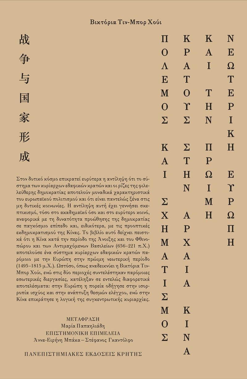 Στον δυτικό κόσμο επικρατεί ευρύτερα η αντίληψη ότι το σύστημα των κυρίαρχων εδαφικών κρατών και οι ρίζες της φιλελεύθερης δημοκρατίας αποτελούν μοναδικά χαρακτηριστικά του ευρωπαϊκού πολιτισμού και ότι είναι παντελώς ξένα στις μη δυτικές κοινωνίες. Η αντίληψη αυτή έχει γεννήσει σκεπτικισμό, τόσο στο ακαδημαϊκό όσο και στο ευρύτερο κοινό, αναφορικά με τη δυνατότητα προώθησης της δημοκρατίας σε παγκόσμιο επίπεδο και, ειδικότερα, με τις προοπτικές εκδημοκρατισμού της Κίνας. Το βιβλίο αυτό δείχνει πειστικά ότι η Κίνα κατά την περίοδο της Άνοιξης και του Φθινοπώρου και των Αντιμαχόμενων Βασιλείων (656‒221 π.Χ.) αποτελούσε ένα σύστημα κυρίαρχων εδαφικών κρατών παρόμοιο με την Ευρώπη στην πρώιμη νεωτερική περίοδο (1495‒1815 μ.Χ.). Ωστόσο, όπως αναδεικνύει η Βικτόρια Τιν-Μπορ Χούι, ενώ στις δύο περιοχές συντελέστηκαν παρόμοιες εσωτερικές διεργασίες, κατέληξαν σε εντελώς διαφορετικά αποτελέσματα: στην Ευρώπη η πορεία οδήγησε στην ισορροπία ισχύος και στην ανάπτυξη θεσμών ελέγχου, ενώ στην Κίνα επικράτησε η λογική της συγκεντρωτικής κυριαρχίας.