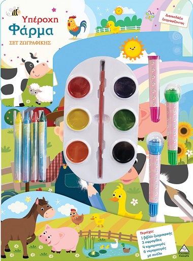 Διασκέδασε χρωματίζοντας την υπέροχη φάρμα! Περιέχει: 1 βιβλίο ζωγραφικής 3 σφραγίδες 4 κηρομπογιές 6 νερομπογιές με πινέλο