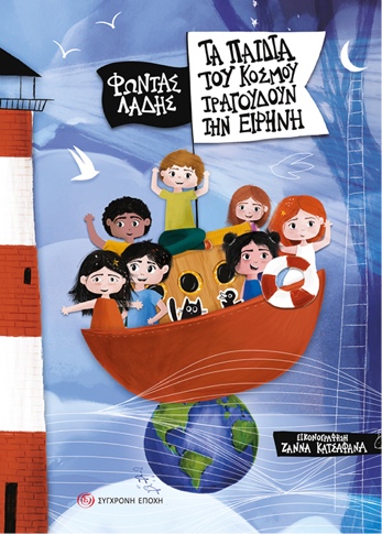 Τα παιδιά σ’ όλη τη Γη βγαίνουν και χαίρονται τον ήλιο, το φεγγάρι και τ’ αστέρια, αγναντεύουν τη στεριά και τη θάλασσα, θαυμάζουν τα δάση, τα ποτάμια και τις λίμνες, τα βουνά και τις πεδιάδες. Ταξιδεύουν στα νησιά, παίζουν με το χώμα, το φως και τον αέρα. Κάθε τόσο όμως ακούγονται, κοντά ή μακριά, δυνατοί κρότοι, φωνές και μπουμπουνητά. «Τι είναι ο πόλεμος;», αναρωτιούνται. «Πώς πάνε σ’ αυτόν οι στρατιώτες και πώς γυρνάνε;» Τα παιδιά μπαίνουν σ’ ένα μεγάλο τρένο και ταξιδεύουν γύρω-γύρω τη Γη. Τραγουδούν με τους φίλους τους τα ζώα, τα ψάρια, τα έντομα και τα πουλιά και υμνούν τη χαρά, τη δουλειά και τη φύση. Το τραγούδι –και το ταξίδι– τελειώνει με μια λέξη: ΕΙΡΗΝΗ. Ο Φώντας Λάδης έχει ασχοληθεί με τη λογοτεχνία για παιδιά. Έχει γράψει ποιήματα, τραγούδια, πεζά, καθώς και αινίγματα και συλλογές λαογραφικών εθίμων για μικρά παιδιά και για νέους προεφηβικής ηλικίας. Το έργο Τα παιδιά του κόσμου τραγουδούν την Ειρήνη γράφτηκε στη δεκαετία του ’80 και έχει μελοποιηθεί από τη Μαίρη Δαλάκου. Μπορεί να αποτελέσει –μελοποιημένο ή μη- τη βάση για μια παράσταση με αφηγητή, 3-4 παιδιά τραγουδιστές, ενώ άλλα παιδιά μπορεί να συμμετέχουν ως ηθοποιοί, χορευτές ή μέλη μιας χορωδίας. Οι ρόλοι είναι: Τα παιδιά της μέρας, τα παιδιά της νύχτας, όλα τα παιδιά μαζί, ο στρατιώτης, ο Πόλεμος, το αστροναυτόπουλο, η Γη, τα ζώα κ.ά. Το έργο μπορεί ακόμα να αποτελέσει τη βάση για μια σχολική παράσταση, για απαγγελίες ή για μικρά ντουέτα παιδιών. Την εικονογράφηση με μια σειρά από πρωτότυπες, ευφάνταστες, πολύχρωμες εικόνες έχει κάνει η Ζάννα Κατσαφάνα.